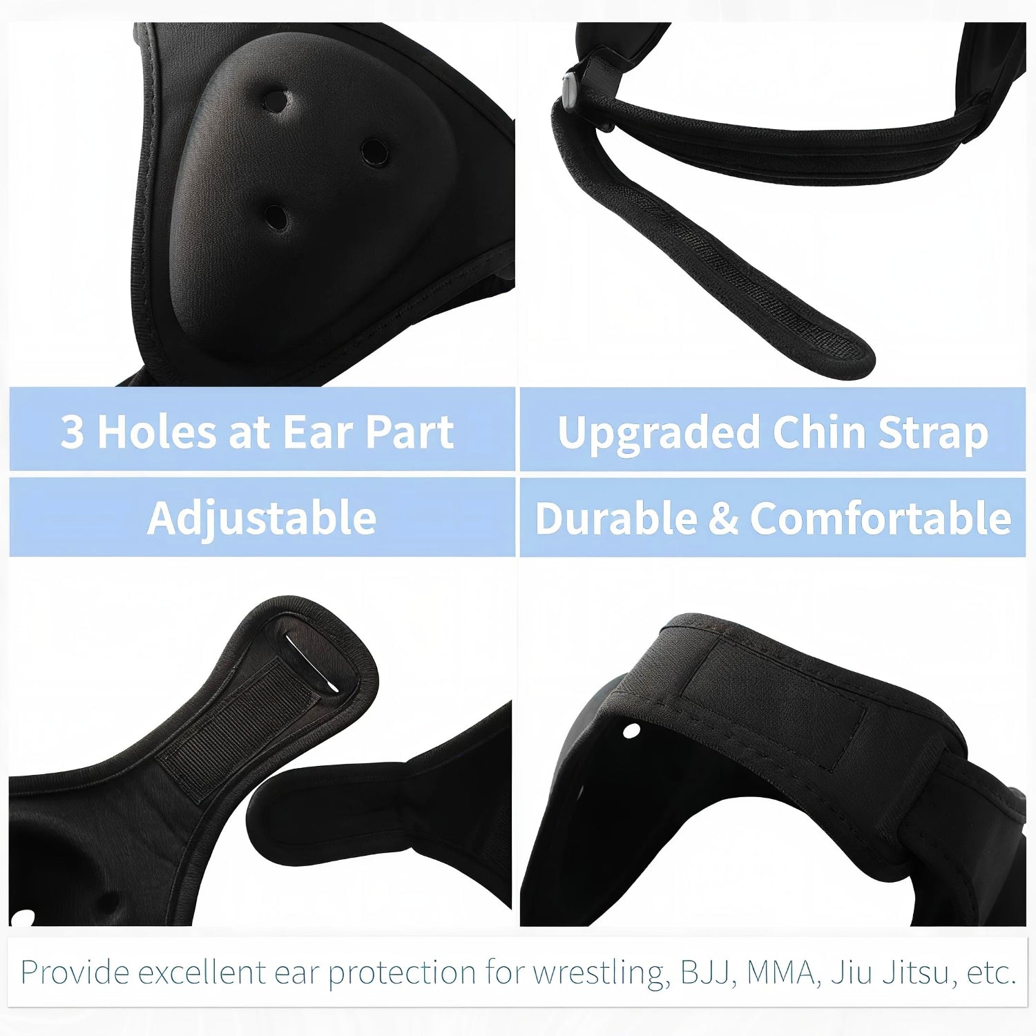 Ergonomic & Fully Adjustable – Designed with a 3D ergonomic shape, this BJJ headguard provides maximum comfort and a secure fit. The strategically placed ear openings improve hearing while training, and the fully adjustable chin strap ensures a snug, personalized fit for athletes of all sizes.